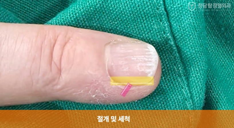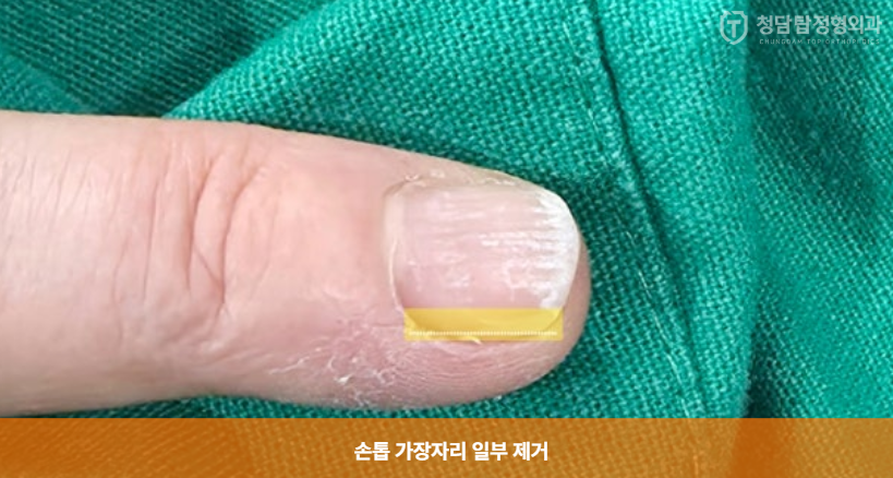 : 먼저 염증이 있는 쪽의 손톱 가장자리 일부(노란 부분)를 조심스럽게 제거했습니다.
